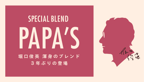 当店では定番ブレンドや季節限定の特別ブレンドなど、様々なテーマを持ったブレンドコーヒーをご用意しておりますが、今回お届けするのは、現在の堀口俊英のアプローチ方法や趣向がふんだんに盛り込まれたブレンド。PAPA’Sブレンドです。堀口の気まぐれで販売する商品であり、3年ぶりの登場ですので、この商品の存在を忘れていた方もいらっしゃるのでは? それでも、楽しみにされていた方が極僅かだけでもいると信じたいところです。