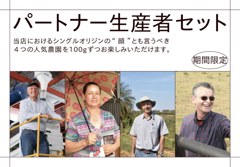 ブラックバーン農園、マカウバ・デ・シーマ農園、サンタカタリーナ農園、ロス・クレストネス。圧倒的な人気を誇る4つのパートナー農園のコーヒーが勢揃いしました!今回は期間限定で各100gずつ計400gの「パートナー生産者セット」を特別にご用意。当店におけるシングルオリジンの”顔”とも言うべき彼らのコーヒーをお楽しみください!