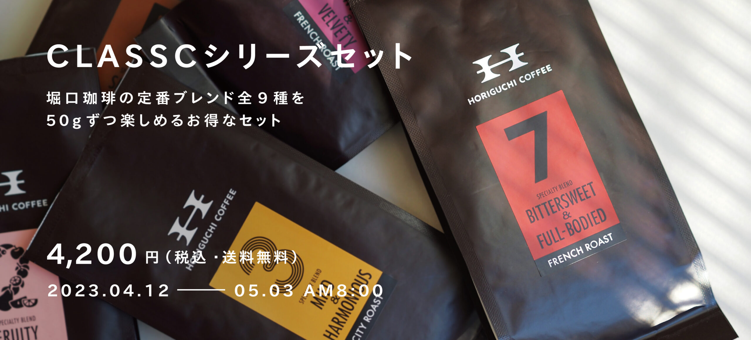 この特集に合わせて、堀口珈琲の定番ブレンド9種類を各50gずつをセットにした「CLASSICシリーズセット」を期間限定にて販売します!